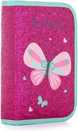Das einlagige Schul-Etui mit Pailletten-Effekt und Schmetterlingsmotiv verbindet ein attraktives Design mit praktischer Organisation. Dank der zwei Klappen finden Sie alles schnell und die Schreibutensilien bleiben in den Schlaufen sicher fixiert. Transparente Folien auf den inneren Klappen ermöglichen es, den Stundenplan stets im Blick zu haben.