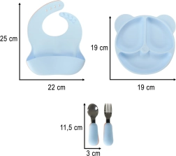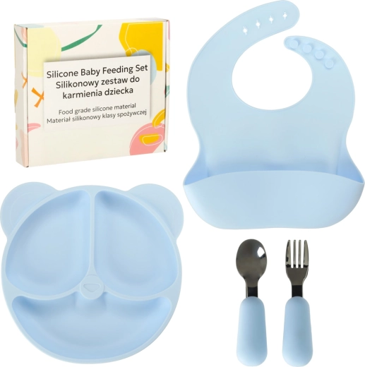 Das Set besteht aus hochwertigem, lebensmittelechtem Silikon ohne schädliche Stoffe, fühlt sich weich an, ist strapazierfähig und leicht zu reinigen. Der unterteilte Teller in Bärenform erleichtert übersichtliches Servieren, das Lätzchen mit tiefer Auffangstasche hält die Kleidung sauber und das ergonomische Besteck mit weichen Silikongriffen liegt gut in kleinen Händen.