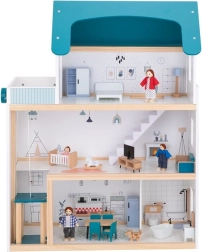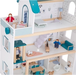 Das Puppenhaus ist mit mehreren Zimmern und einem funktionierenden Aufzug ausgestattet, was Kindern eine realistische und bereichernde Erfahrung bietet.