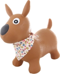 Gummihüpftier Hund mit Halstuch, ca. 54 x 47 x 25 cm groß. Sitzhöhe ca. 24 cm. Verpackungsmaße ca. 32,5 x 20 x 15 cm. Maximale Tragkraft 50 kg. Eine Pumpe ist im Lieferumfang enthalten. Alter 1+