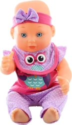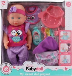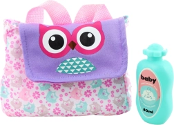 Im Set enthalten ist eine praktische Ausstattung: Schnuller, Fläschchen, Tellerchen und Löffel zum Füttern sowie ein niedliches Stoffrucksäckchen mit Eulenmotiv zum Transport des Zubehörs. So wird die Puppe zur idealen Begleiterin für das Rollenspiel zu Hause und unterwegs.