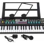 Lieferumfang: Keyboard, Netzadapter, Mikrofon, Notenständer. Stromversorgung über Netz (Adapter enthalten) oder 6× AA 1,5 V (nicht enthalten).