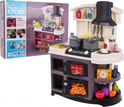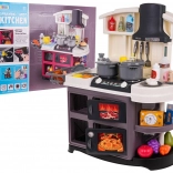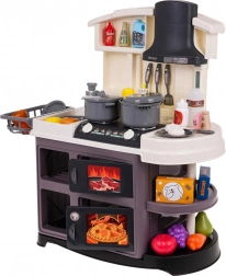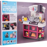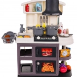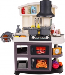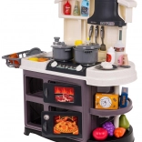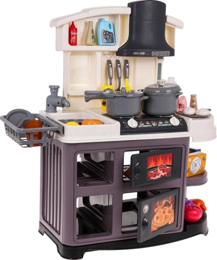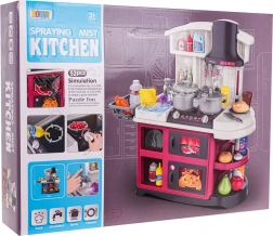 Diese Kinderküche aus Kunststoff ist hochwertig verarbeitet und mit allem ausgestattet, was Kinder zum Kochspiel brauchen. Beim Drehen der Knöpfe ertönen realistische Geräusche des Kochens und Bratens, und die Brenner leuchten. Durch das Hinzufügen weniger Tropfen Wasser entsteht feiner kalter Dampf, der den Eindruck echten Kochens verstärkt. Der Wasserhahn läuft wirklich, sodass Kinder das Geschirr im Spülbecken „abwaschen“ können.