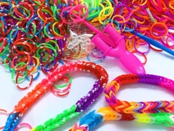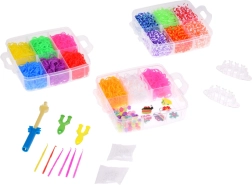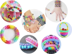 Haken, Schleudern und zwei Webrahmen ermöglichen es, von einfachen bis zu komplexen Armbändern und Accessoires alles zu gestalten.