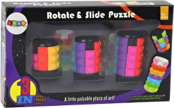 Lernen Sie das Set von drei logischen Puzzles in Zylinderform kennen, die stundenlangen Spaß und mentales Training bieten. Die Bestimmung der Farben in einer Reihe durch Drehung der Ringe und Verschiebung der farbigen Blöcke wird eigene Freude bereiten.