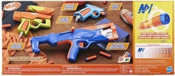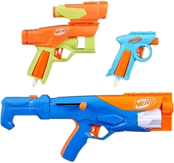 Das Set enthält drei verschiedene Blaster in den Hauptfarben Blau und Orange, die unterschiedliche Spielstile ermöglichen.