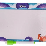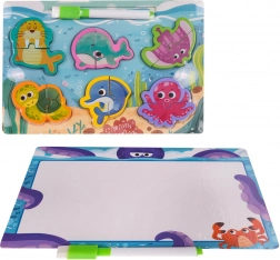 Diese doppelseitige Holztafel kombiniert Zeichnen und Puzzeln in einem kompakten Set. Auf der einen Seite befindet sich eine glatte Fläche zum Zeichnen mit dem mitgelieferten abwischbaren Marker mit Radierer, auf der anderen Seite eine Reliefplatte mit Aussparungen zum Platzieren der Holzteile mit Meerestieren. Kinder trainieren Fantasie, Geduld und Formerkennung.