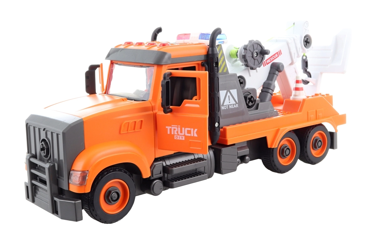 Schöner großer abschraubbarer Abschleppwagen. Betrieb mit 3 AG13-Batterien, die im Lieferumfang enthalten sind. Auf dem Autodach befinden sich 4 Tasten mit Funktionen – Starten, Hupen, Rückfahrpiepen und Melodien. Das Auto hat einen Schwungradantrieb. Material: Kunststoff. Ein Schraubendreher ist im Lieferumfang enthalten. Verpackt in einer offenen Schachtel. Verpackungsmaße ca. 41×22×13 cm. Fahrzeugmaße 36×15×11 cm. Alter 3+.