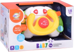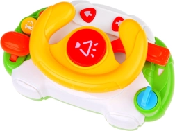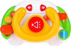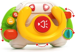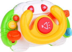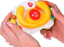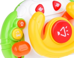 Das Lenkrad ist so gestaltet, dass es leicht in den Kinderwagen oder die Reisetasche passt. Dank intuitiver Tasten lernen Kinder die Bedienung schnell: rot für die Hupe, gelb für Melodien (3 Arten) und blau für Sounds und Musik (4 Arten). Während der Musikwiedergabe leuchtet die Lenkradmitte rhythmisch auf.