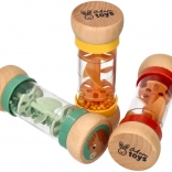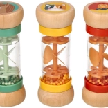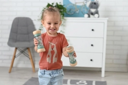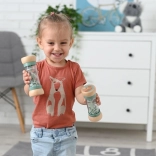 Die Holzenden des Spielzeugs tragen eine schöne Illustration eines Küken, was zu seinem ästhetischen Eindruck beiträgt. Dieses sensorische Spielzeug kann von den Kleinsten zur Entwicklung von motorischen Fähigkeiten und Koordination verwendet werden.