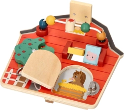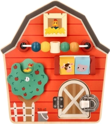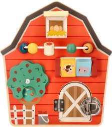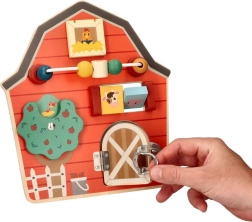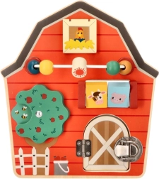 Dieses aktive Holzbrett in Form einer Scheune ist so gestaltet, dass es die Feinmotorik und den Spaß bei Kindern fördert. Mit einem lebhaften Bauernhof-Thema und Farben bildet es nicht nur aus, sondern unterhält auch die kleinsten Familienmitglieder. Interaktive Elemente wie verschiebbare Perlen, ein drehbarer Baum und Türen mit Riegeln helfen, die Hand-Augen-Koordination zu fördern.