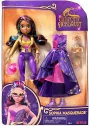 Stellen Sie die Puppe Sophia Maskerade aus der beliebten Einhorn Akademie-Serie vor. Diese 23 cm große Puppe ist von Netflix und beliebten Büchern inspiriert und bringt Magie und Kreativität in Ihr Zuhause. Sophia ist detailgetreu gestaltet und kommt mit 9 Modeaccessoires, darunter eine abnehmbare Jacke, Halskette und Schuhe, die Sie leicht gegen ein asymmetrisches Kleid, Gürtel, Maske und violette Schuhe tauschen können.