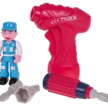 Enthalten sind eine Fahrerfigur, ein Kinderbohrer/Schraubendreher und 3 austauschbare Bits (Schlitz, Kreuz, Sechskant) für realistischen Spielspaß als kleiner Mechaniker.