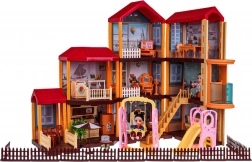 Dieses geräumige Puppenhaus aus Kunststoff in lebendigen Farben bietet Kindern unzählige Möglichkeiten für kreatives Spielen. Das Innere umfasst Küche, Bad, Musikzimmer, Wohnzimmer, Schlafzimmer, Ankleidezimmer und Tageszimmer. Rund um das Haus gibt es einen Zaun und eine Außenfläche mit Sitzbereich, Sonnenschirm und einem Spielplatz mit Rutsche und Schaukel.