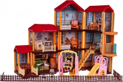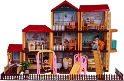 Küche, Bad, Schlafzimmer, Musikecke, Möbel, Zubehör, 2 Puppen, 2 Hündchen und verschiedene Spielelemente für endlosen Spaß.