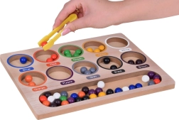 • Fördert die Selbstständigkeit, indem das Kind selbstständig Kombinationen und Anordnungen der Kugeln wählt.