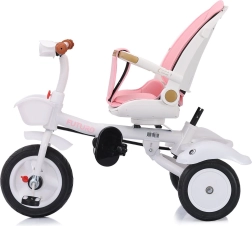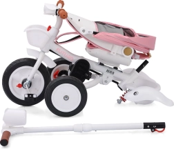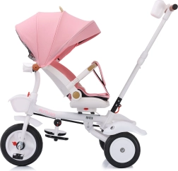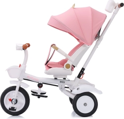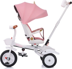 Das Dreirad mit Verdeck 2-in-1 Futuro Princess Chipolino kombiniert Komfort, Sicherheit und Spaß. Dank drehbarem Sitz (in Fahrtrichtung und gegen die Fahrtrichtung), höhenverstellbarer Schiebestange und klappbaren Elementen passt es sich leicht den aktuellen Bedürfnissen von Kind und Eltern an. Lenker mit Musik und Licht machen jede Ausfahrt zum Vergnügen.