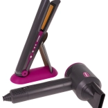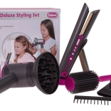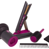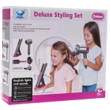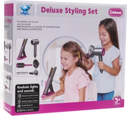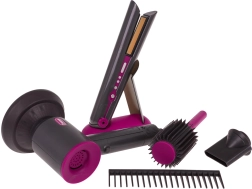 Ideales Friseursatz für Kinder, die kleine Friseurinnen werden möchten. Umfangreich ausgestattetes Set enthält einen Föhn mit austauschbaren Aufsätzen, einen Haarglätter, einen Kamm und eine Bürste. Der Föhn wird mit zwei AA-Batterien betrieben (nicht im Lieferumfang enthalten) und erzeugt Geräusche wie beim echten Föhnen. Der Haarglätter leuchtet und erzeugt typische Geräusche, wenn er eingeschaltet ist.