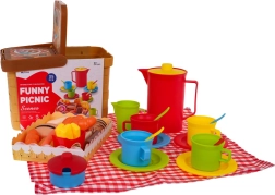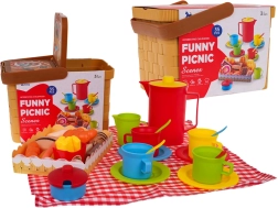 Lieferumfang: Korb mit Griff, Picknickdecke, Karton-Tablett, große und kleine Kanne mit Ausguss, 4 Teller, 4 Becher, 4 Löffel, Topf mit Deckel, Körbchen mit Leckereien (Croissant, 7 Kekse, Schokolade, Waffel, Hotdog, Pommes und Ketchup).