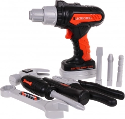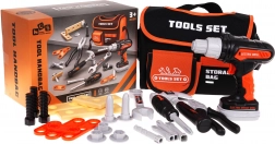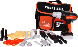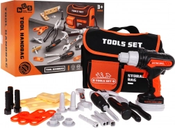 Die ausgeklügelte Tasche bietet ein Hauptfach mit Klettverschluss, eine Fronttasche und Halterungen für Werkzeuge. Die Elektrobohrmaschine für 2× AA-Batterien (inklusive) kann anziehen und lösen, verfügt über wechselbare Bits und einen herausnehmbaren Akku – für ein authentisches Erlebnis beim Reparieren und Montieren.