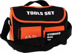 Robuste Aufbewahrungstasche mit Griff und Schultergurt. Hauptfach mit Klettverschluss, Fronttasche und innere Trennfächer für die übersichtliche Aufbewahrung der Werkzeuge.