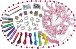Dieses umfassende Kreativset ist ideal für kleine Fashionfans und alle Kinder, die gerne basteln und ihren eigenen Schmuck tragen. Im Set ist alles enthalten – von Metallanhängern und synthetischen Bändern über Steinchen, Glitzer und Kleber bis hin zum praktischen Karton-„Schmuckbaum“ zum Präsentieren der fertigen Stücke.