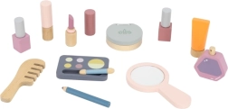 Spiegel, Lidschattenpalette, Lacke, Lippenstifte, Parfüm und Kamm bestehen aus Holz und dienen als Nachbildung von Kosmetik – ideal für sicheres, fantasievolles Schminken.
