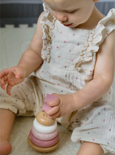 Das Aufstecken der Ringe auf den Stab trainiert ganz natürlich Griff, Präzision und die Hand–Auge–Koordination – ideal für die ersten motorischen Herausforderungen.