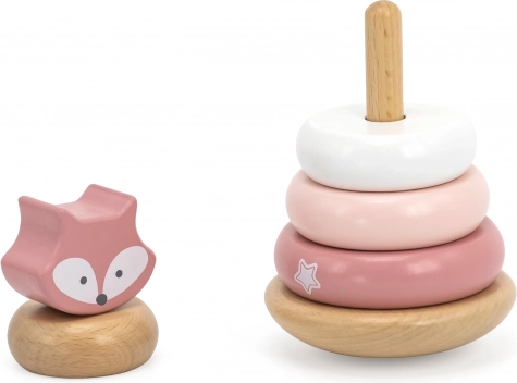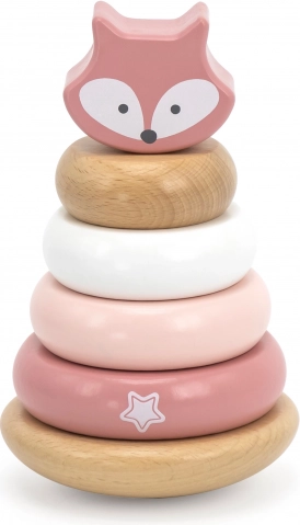 Ansprechende Pastelltöne und das obere Fuchselement motivieren Kinder zum Stapeln sowie zum Lernen von Farben und Größen.