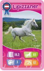 Die Regeln sind einfach: Die Spieler teilen das gesamte Deck aus, der startende Spieler wählt eine Kategorie auf seiner obersten Karte, und alle vergleichen die Werte. Wer den höchsten Wert hat, nimmt die Karten und legt sie unter sein Deck. Das Spiel ist schnell, übersichtlich und lehrreich – eine großartige Wahl für Pferdeliebhaber und Einsteiger.