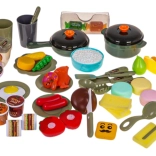 Topf, Pfanne, Besteck, Teller, Lebensmittel mit Klett, Getränke, Gewürze, Kreidetafel und Aufkleber – alles für kreatives Kochen.