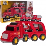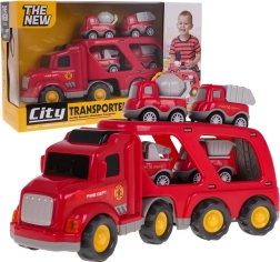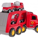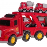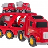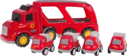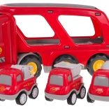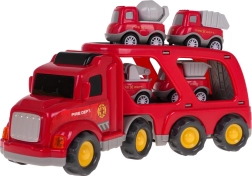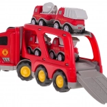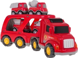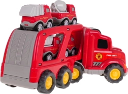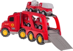 Dieses detailreich gestaltete Feuerwehr-Set bietet Kindern stundenlangen kreativen Spielspaß. Der große Transport-LKW mit abkoppelbarem Anhänger befördert vier kleinere Arbeitsfahrzeuge. Durch Drücken der Taste auf dem Kabinendach leuchten die Frontscheinwerfer und es ertönen authentische Start-, Fahr- und Hupgeräusche.