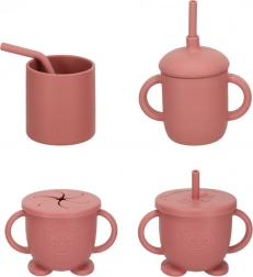 Komplettes Silikongeschirr-Set für Kinder in dunkelrosa enthält Teller, Schüsseln, Tassen und Besteck. Das Geschirr besteht aus sicherem Silikon, ist leicht zu reinigen und ideal zum Lernen des selbständigen Essens.
