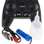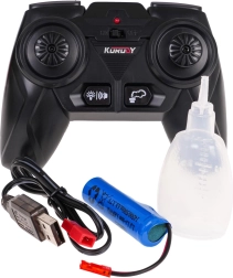 Die 2,4-GHz-Fernsteuerung ermöglicht eine sanfte Steuerung vorwärts, rückwärts, rechts und links ohne Störungen. Der integrierte 3,7 V 500 mAh Li-Ion-Akku liefert ausreichend Energie fürs Spielen, das Aufladen erfolgt per USB. Den Raucheffekt aktivieren Sie mit der beiliegenden Wasserflasche für ein noch realistischeres Erlebnis.
