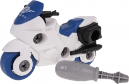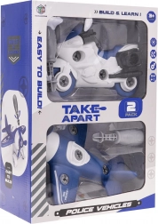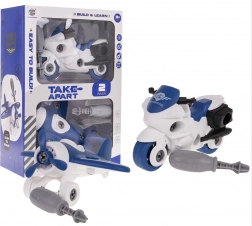 Das demontierbare Set umfasst ein Motorrad und ein Flugzeug sowie zwei Schraubendreher, die es Kindern ermöglichen, die Fahrzeuge in Einzelteile zu zerlegen und dann wieder zusammenzusetzen. Zusätzlich können sie das Schiff anhand der bebilderten Anleitung zusammenbauen.