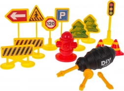 Teil des Sets ist auch ein Schraubenzieher mit austauschbaren Aufsätzen und verschiedene Verkehrszeichen. Dadurch können Kinder mehr über Verkehrssicherheit und Regeln erfahren.