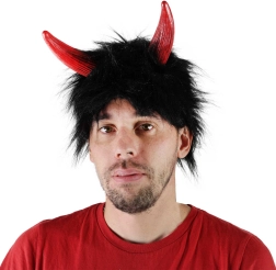 Diese Teufelsperücke ist die ideale Wahl für alle, die ihr Aussehen im Handumdrehen verändern und auf dem Karneval glänzen möchten. Natürlich wirkendes schwarzes Haar, kurzer Pony und rote Hörner unterstreichen den teuflischen Look ohne aufwendiges Make-up.