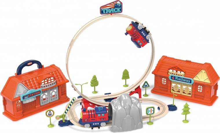 Die Lok wird mit 2× AAA-Batterien betrieben (nicht im Lieferumfang enthalten) und ganz einfach über den Schornstein als ON/OFF-Taste gesteuert. Zum Set gehören die Strecke, die Lok, 2 Gebäude, eine Haltestelle, eine Brücke, eine Schranke, ein Verkehrszeichen, Bäume und Lichter. Dank der bebilderten Anleitung auf der Innenseite der Verpackungskarte ist der Aufbau schnell und einfach.