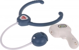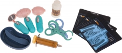 Stethoskop mit Herzschlag-Sound, Thermometer mit Licht, Spritze, Schere, Pinzette, Fläschchen, Pipette, Zahnärztewerkzeuge und weitere Accessoires für kreatives Spielen.