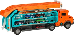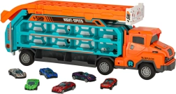 Die orange-blaue Ausführung zieht Kinder an, und der einfache Mechanismus ermöglicht einen schnellen Wechsel vom Transporter zur Rennstrecke.