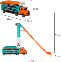 Der multifunktionale Lkw dient auf den ersten Blick als praktischer Transporter – er fasst bis zu 6 kleine Autos und ermöglicht ihren einfachen Transport. In wenigen Augenblicken verwandelt er sich jedoch in ein beeindruckendes Rennset mit zwei parallelen Spuren für actionreiche Duelle und fairen Spielspaß unter Geschwistern.
