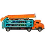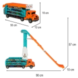 Die orange-blaue Ausführung zieht Kinder an, und der einfache Mechanismus ermöglicht einen schnellen Wechsel vom Transporter zur Rennstrecke.