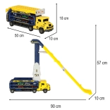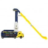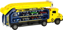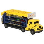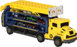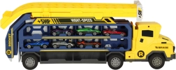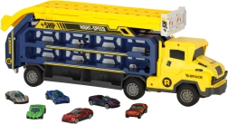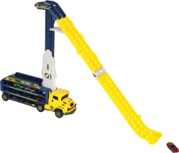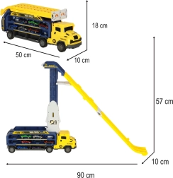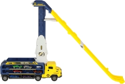 Dieser multifunktionale Autotransporter verwandelt sich im Handumdrehen in eine beeindruckende zweispurige Rennstrecke. Kinder können bis zu sechs kleine Autos transportieren und sie anschließend auf parallelen Bahnen zu spannenden Rennen starten lassen. Das attraktive gelb-blaue Design lädt zum Spielen ein und fördert Feinmotorik sowie Augen-Hand-Koordination.