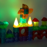 Integrierte Lichtelemente verwandeln jede Konstruktion in ein strahlendes Spektakel und motivieren Kinder zu weiterem Gestalten – besonders in schummriger Umgebung.