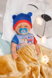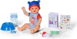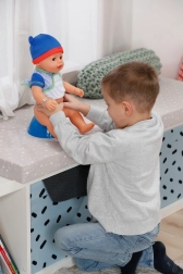 Wir stellen Jonas vor! Die Puppe Jonas, bekannt aus der animierten BABY born Serie, die du auf dem BABY born Kanal auf YouTube auf Tschechisch ansehen kannst, kannst du jetzt auch zu Hause haben. In einem neuen Outfit und mit 10 Accessoires. Er bringt auch einen magischen Teller mit: Wenn du etwas Wasser auf den Teller mit der weißen Platte gibst, erscheint darauf ein leckeres Essen mit einem niedlichen Gesicht – so macht das Füttern der Puppe noch mehr Spaß. Wenn du Jonas nach dem Füttern (mit Wasser) oder nach dem Trinken aus dem Fläschchen auf das Töpfchen setzt und auf seinen Bauch drückst, erscheint auf der Platte im Töpfchen ein Bildchen von Pipi und Kaka. Trinkt Jonas Wasser aus dem Fläschchen, kann er Tränen weinen und braucht Beruhigung. Helfen kann der magische Schnuller: Drehst du ihn im Mund um 180 Grad, öffnen oder schließen sich seine Äuglein. Drehst du ihn noch einmal, passiert das Gegenteil. Jonas kann aber noch mehr: Er hat bewegliche Gelenke und kann mit in die Badewanne. Jetzt trocknet er sogar schneller als je zuvor: Um die Puppe nach dem Spielen gründlich zu reinigen, kann ein Bein abgenommen werden, wodurch eine größere Öffnung zum Reinigen entsteht. So kann das Wasser leichter abfließen. Für ein noch spannenderes Spiel bringt Jonas in sein neues Zuhause neben dem Fläschchen, Schnuller, Teller mit der Platte mit Essensbild und Töpfchen mit der Platte mit Pipi- und Kaka-Bild auch eine Windel, eine Geburtsurkunde, einen Stickerbogen und zwei Freundschaftsbändchen mit – eines für die Puppe und eines für ihre kleine Mama – als Zeichen einer langen und liebevollen Freundschaft zwischen Kind und Puppe.
