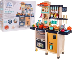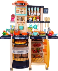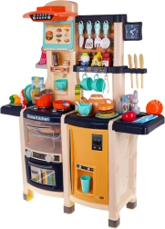 Diese interaktive Küche ist aus hochwertigstem Kunststoff gefertigt und in lebendigen Farben gehalten, die Kinder zum Spielen anregen. Auf der Arbeitsplatte der Küche befindet sich ein interaktives Kochfeld mit Herdplatten. Beim Drehen eines Knopfes hört man das Geräusch des Kochens und beim anderen das Bratgeräusch, begleitet von der Beleuchtung der Herdplatten. Der Wasserhahn gibt tatsächlich Wasser ab, was es den Kindern ermöglicht, Spielgeschirr zu waschen. Zum Set gehört auch ein Kühlschrank-Attrappe mit öffnbaren Türen und einem Wasserspender, ein beleuchteter Ofen und Geschirrspüler, eine Kaffeemaschine, ein Belüftungsfeld mit Lichtern und Geräuschen sowie viele weitere Zubehörteile.