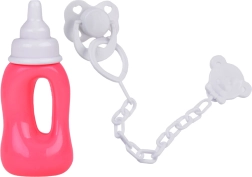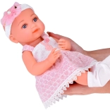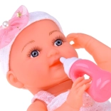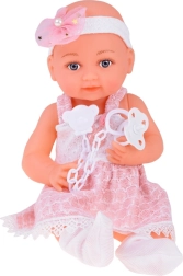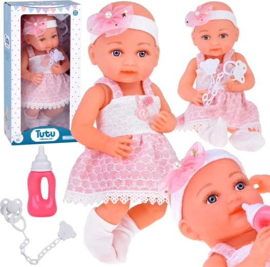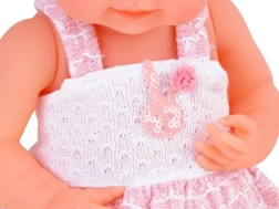 Das freundliche Gesicht der Puppe lädt zum Spielen ein. Das Baby ist in ein weiß-rosa Kleid gekleidet, geschmückt mit Bommeln und Spitze. Zwar hat das Baby keine Haare, aber sein Köpfchen ziert ein Tüllband mit Schleife und Perlen. An den Füßchen trägt es weiße Söckchen.