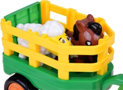 Der gelb‑grüne Anhänger lässt sich öffnen, um das Be- und Entladen zu erleichtern. Kinder können Pferd und Schaf transportieren und eigene Bauernhofgeschichten erfinden.