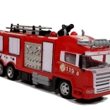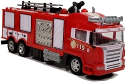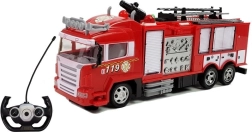 Das rote, große Feuerwehrauto steht auf Rädern mit Gummiprofil. Es meistert problemlos kleine Unebenheiten auf seinem Weg. Das Fahrzeugdesign betont die wichtigsten Elemente, sodass es seinem Pendant in Originalgröße ähnelt.