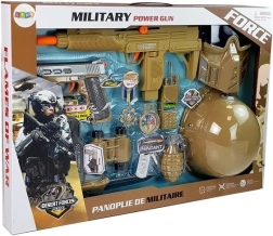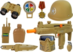 Großes Militärset für kleine Abenteurer bietet stundenlange kreative Unterhaltung. Enthält Helm, Maske, zwei Pistolen mit Lichteffekten und Schussgeräusch, Granate, Fernglas, Kompass, Messer und weiteres Zubehör. Alles aus robustem Kunststoff und in einheitlicher Militärfarbe. Ideal zum Verkleiden, für gemeinsames Spielen und als Geschenk – verpackt in einer Geschenkbox. Stromversorgung der Pistolen: 3× AG13 (enthalten). Geeignet ab 3 Jahren, CE, EN 71.
